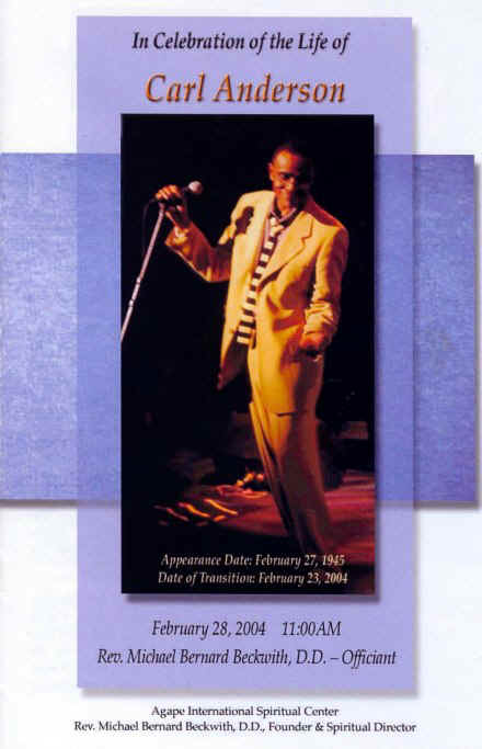 Just wanted to make a couple comments on the wonderful celebration of like for Carl Anderson at the memorial service on Saturday. I had attended the ceremony alone, but certainly did not feel alone when I left. There were so many warm and caring people, dancing, singing, holding hands, crying, and praying together. Carl's spirit filled everyone in the room.