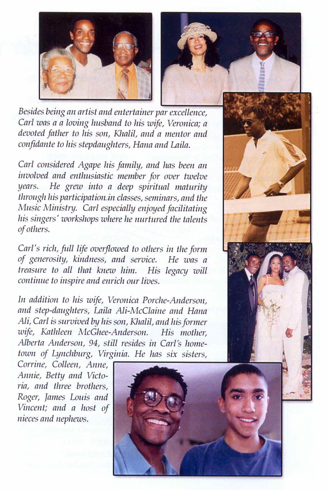 | Please make your most generous tax-deductible contributions to: Agape Church "Carl Anderson Memorial Fund" 5700 Buckingham Parkway Culver City, CA 90230 Thank You. |