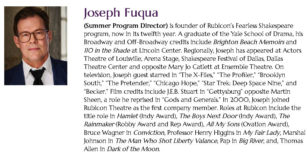 JOSEPH FUQUA (Richard Hannay) most recently appeared with Rubicon as Sheriff/Charle/Joe in Bonnie & Clyde, Thomas Allen in Dark of the Moon and Jimmy in Almost Maine directed by RTC Associate Artistic Director Stephanie Coltrin. Last spring, Joseph appeared with the Pinehurst Players, NC as Polonius in Hamlet. An MFA graduate of the Yale School of Drama, his Broadway and Off-Broadway credits include Brighton Beach Memoirs, 110 in the Shade at Lincoln Center, and Raft of the Medusa. Regionally, Joseph has appeared as Octavius Caesar in Antony and Cleopatra at Actors Theatre of Louisville; Alexei in A Month in the Country at Arena Stage; Iago in Othello for Shakespeare Festival of Dallas; Louis in Angels in America at Dallas Theatre Center; and Six Dance Lessons in Six Weeks, Macbeth and Fallen Angels at Ensemble Theatre, Santa Barbara. On television, Joseph guest starred in “The X-Files,” “The Profiler,” “Brooklyn South,” “The Pretender,” “Chicago Hope,” “Star Trek: Deep Space Nine,” “Becker,” and the pilot “Second Nature.” Film credits include “Ed’s Next Move,” “David Searching,” “Heyday,” and as J.E.B. Stuart in “Gettysburg” opposite Martin Sheen, a role he reprised in the film “Gods and Generals.” In 2000, Joseph joined Rubicon Theatre as the first company member (this year marks his 25th season!). His 35 roles with the company include the title role in Hamlet (Indy Award), The Boys Next Door (Indy Award), The Little Foxes, The Rainmaker (Robby Award and Rep Award), Murder in the First, The Glass Menagerie, All My Sons (Ovation Award), Man of La Mancha, Conviction, Professor Henry Higgins in My Fair Lady, The Importance of Being Earnest, Dancing at Lughnasa, The Man Who Shot Liberty Valance, Fuddy Mears, King Lear, Incognito, South Pacific, and, just prior to the pandemic, Pap in Big River. In July, Joseph directed his sixteenth Shakespeare production with Rubicon’s Fearless Shakespeare Intensive which he co-founded. He currently serves as the director of Rubicon’s Summer Youth Program. Joseph is eternally grateful to Jim O’Neil and Karyl Lynn Burns and Artistic Associate Jenny Sullivan for their trust and support over the years. Viva la Rubicon!