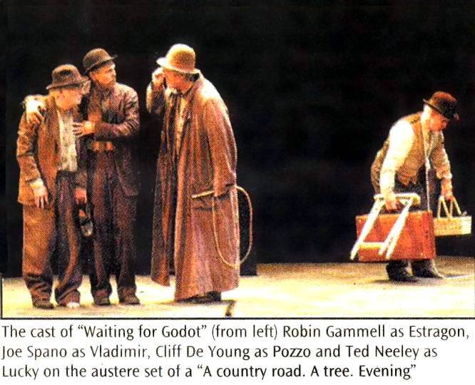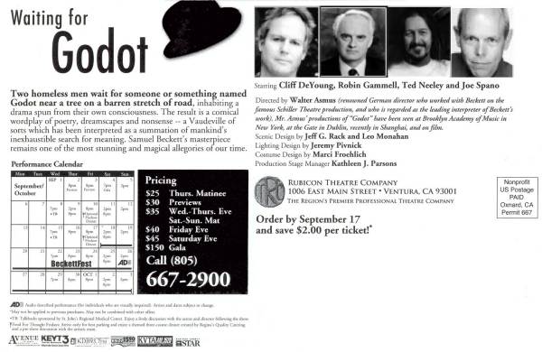 SYNOPSIS: Two homeless men wait for someone or something named Godot near a tree on a barren stretch of road, inhabiting a drama spun from their own consciousness. The result is a comical wordplay of poetry, dreamscapes and nonsense, a Vaudeville of sorts which has been interpreted as a somber summation of mankind's inexhaustible search for meaning. Samuel Beckett's language pioneered an expressionistic minimalism that captured the existentialism of post-World War II Europe. His play remains one of the most stunning and magical allegories of our time. Emmy Award-winning actors Joe Spano and Robin Gammel play Vladimir and Estragon. With Cliff DeYoung as Pozzo and Ted Neeley as Lucky. This production is part of the Rubicon Theatre's Beckett Festival. |