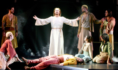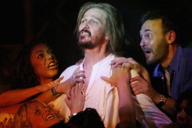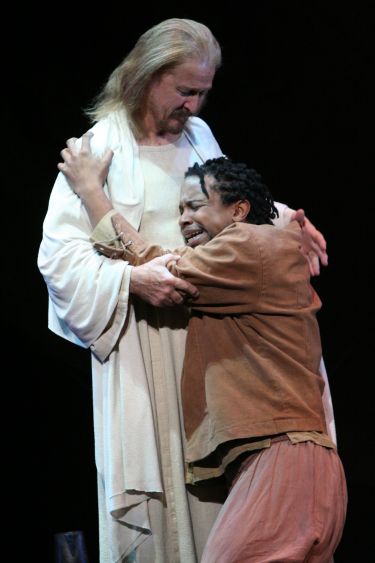 That is why it was so painful (even spiritually) to watch him a few days ago trying to fool time, history, and the Bible itself—still playing Jesus in the musical, at the age of 66.  Granted, Mr. Neeley can still carry a tune, and occasionally hit those heavenly-high, screeching notes of pathos and anger that were once near-mystical.  But, though still relatively fit enough to hang on the Cross and groan for twenty minutes in the finale, he just doesn’t look that great in the robe, and the biblical amount of make-up painted across his face only seems to exacerbate one of the greatest cases of miscasting since the Romans.