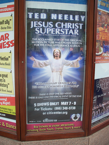 The website Von found is for venues who are presenting JCS to upload the marketing materials for the show. I asked her about website use, and she told me that, while she would be more than glad to allow it, she didn't have the capacity, because THIS IS AN ANDREW LLOYD WEBBER SHOW (So, sorry folks, at the moment, I can't post the materials here). Gee, has the "Master" finally woken up to the fact that TED IS THE ONLY REAL JESUS JCS ever had? (Or maybe he's decided he'd actually like to stage a JCS that will be SUCCESSFUL? I mean, how many times, without Ted, has this really worked for any length of time? Poor Glenn Carter and Eric Kunze, though talented, had bigger shoes than they could fill.).