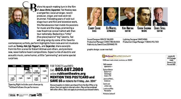 The singer-songwriter-actor will perform with his Little Big Band during a 10-concert run at the Rubicon Theatre in Ventura, 1006 E. Main St., with a preview at 7 tonight, opening night at 7 p.m. Saturday, and regular shows at 2 p.m. Sunday and Jan. 29, 2 and 7 p.m. Wednesday, 7 p.m. Thursday and Jan. 27, and 2 and 8 p.m. Jan. 29. Opening night: $125 (includes a post-show party). Regular shows: $25-$54 general admission, $25 full-time students with ID. For tickets or more information, call 667-2900 or visit rubicontheatre.org. Neeley's website is neeleyontheroad.com.