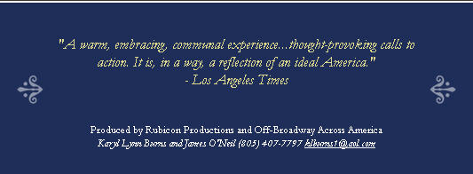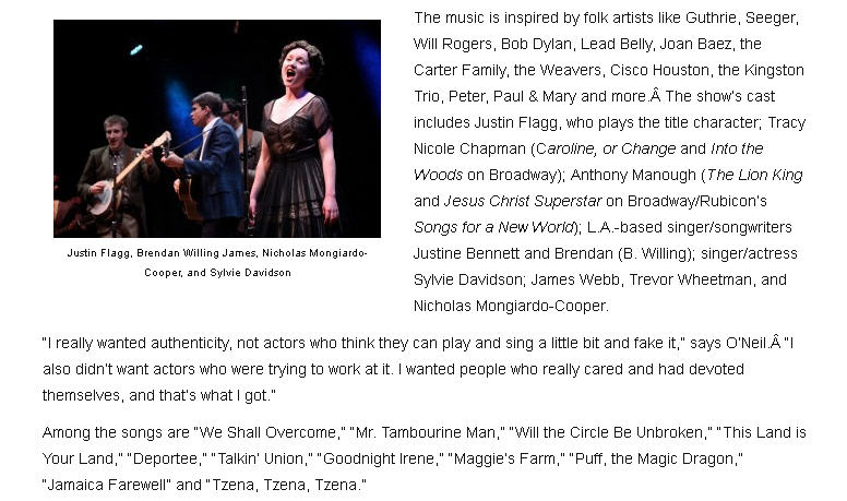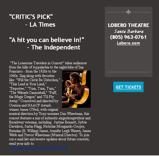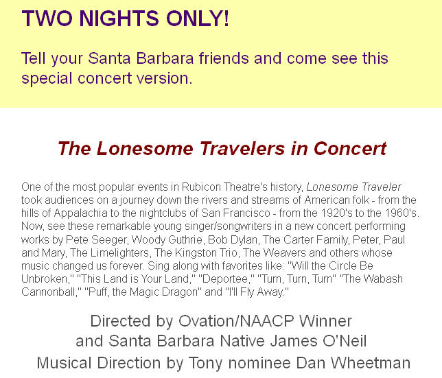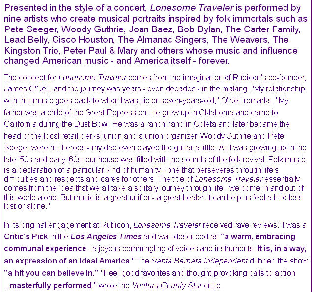 A few of the well-known song titles include "Will the Circle Be Unbroken," "This Land is Your Land," "Deportee," "Talkin' Union," "Goodnight Irene," "Puff, the Magic Dragon," "Mr. Tambourine Man," "We Shall Overcome," "Jamaica Farewell," "Tzena, Tzena, Tzena" and "Maggie's Farm." New songs added for this return engagement include "Turn, Turn, Turn," "The Wabash Cannonball" and others. In its original engagement at Rubicon, Lonesome Traveler received rave reviews. It was a Critic's Pick in the Los Angeles Times and was described as "a warm, embracing communal experience...a joyous commingling of voices and instruments. Each voice retains its individuality yet twines with others to create a more glorious whole. It is, in a way, an expression of an ideal America." The Santa Barbara Independent dubbed the show "a hit you can believe in." StageHappenings.com said the show was "a rousing bit of entertainment." "Feel-good favorites and thought-provoking calls to action...masterfully performed," wrote the Ventura County Star critic. About the Production The concept for Lonesome Traveler comes from the imagination of James O'Neil. O'Neil is co-founder of Rubicon Theatre Company and accepted the L.A. Drama Critics' Circle Award in 2010 for "Sustained Excellence" on behalf of the company. He helmed Rubicon's Ovation Award-winning production of Arthur Miller's All My Sons, received the NAACP Award for Directing for Rubicon's production of Driving Miss Daisy with Michael Learned which was presented during the 50th Anniversary of Brown vs. Board of Education, and has also directed classics by Edward Albee and Tennessee Williams for the company, in addition to numerous new works. The journey to Lonesome Traveler for O'Neil was years - even decades - in the making. "My relationship with this music goes back to when I was six or seven-years-old," O'Neil remarks. "My father was a child of the Great Depression. He grew up in Oklahoma and came to California during the Dust Bowl. He was a ranch hand in Goleta and later became the head of the local retail clerks' union and a union organizer. Woody Guthrie and Pete Seeger were his heroes - my dad even played the guitar a little. As I was growing up in the late ‘50s and early ‘60s, our house was filled with the sounds of the folk revival. "Even then I knew that the music was for me - and for all of us. Folk music is a declaration of a particular kind of humanity - one that perseveres through life's difficulties and respects and cares for others. The title of Lonesome Traveler essentially comes from the idea that we all take a solitary journey through life - we come in and out of this world alone. But music is a great unifier - a great healer. It can help us feel a little less lost or alone." O'Neil's thoughts are echoed by the original Musical Director Dan Wheetman: "This music was born out of hardscrabble living. However, it reflects the joy of life; no matter how many obstacles we face, the human spirit rises above and rejoices in being alive." Wheetman was the first person O'Neil called once he began work on Lonesome Traveler. A member of the band Marley's Ghost, Wheetman was last at Rubicon as Musical Director for Back Home Again, for which he received an Ovation Award. He wrote the music for the stage version of The Cider House Rules, and has garnered several L.A. Drama Critics' Circle Awards for Musical Direction and a Tony nomination as a writer for It Ain't Nothin' But the Blues at Lincoln Center. "The impetus to write Lonesome Traveler has grown over the past few years," says O'Neil. "There has been a resurgence of interest in folk music, with a bumper crop of young musicians reinterpreting and re-popularizing some of the older songs. I suddenly realized I wanted to - needed to - help create a context for a new generation. "Some of what we think of as American folk music came from other cultures as immigrants came to America: songs derived from traditional English or Scottish ballads, Irish reels, African spirituals or Bahamian lullabies, for example. These songs express universal feelings - love, regret, hunger, jealousy, humor, pain or pride. They were passed from generation to generation and then recorded in the South and Southeast in the mid-1920s by preservationists and opportunists. "Other songs relate to the times in which they were written," says O'Neil. "Folk music is ‘The People's Music' and these songs are the people's responses to societal ills - issues of oppression, religious persecution, unemployment, unsafe working conditions, poverty and war. These are often story songs. "Still other American folk songs influence and change the times," continues O'Neil. "Many of these are songs of praise, solidarity and rebellion and include patriotic songs, union anthems, political commentary, etc. To me, Lonesome Traveler is about ‘the history that made the music, and the music that made history'." Throughout the process, O'Neil has been working closely with designer Tom Giamario, with whom he has collaborated on numerous shows including Rubicon's successful environmental production of Fiddler on the Roof. In his work, Giamario has focused on creating a connection between the performers and the audience that might be similar to a hootenanny or folk concert. Says Giamario, "The performers were aware that it wasn't about them, nor was it about whose song it was or where it came from. It was, ‘Hey, we're ALL going to participate in this together.' Something like an old-time Baptist revival - the experience of sharing the music rejuvenates - it's cathartic. There's something that happens when we sing together. Of course, in folk music there's often a narrative that helps the audience relate to the experience. "From the outset, Jim was clear that he wanted to engage the audience - he didn't want to create a revue where the audience could be detached or distant," continues Giamario. "Folk music is very much about participation, not observation. W